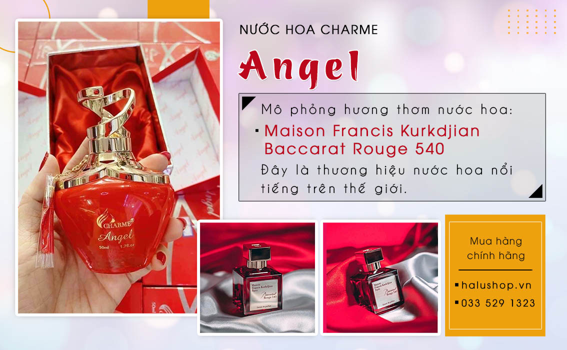 Nước hoa Charme Angel có mùi hương giống nước hoa Maison Francis Kurkjian Baccarat Rouge 540 - Một thương hiệu Nước hoa nổi tiếng trên thế giới. Các bạn cứ vô tư trải nghiệm nước hoa nam cao cấp hàng hiệu nhưng lại tiết kiệm được cả triệu đồng.