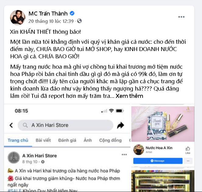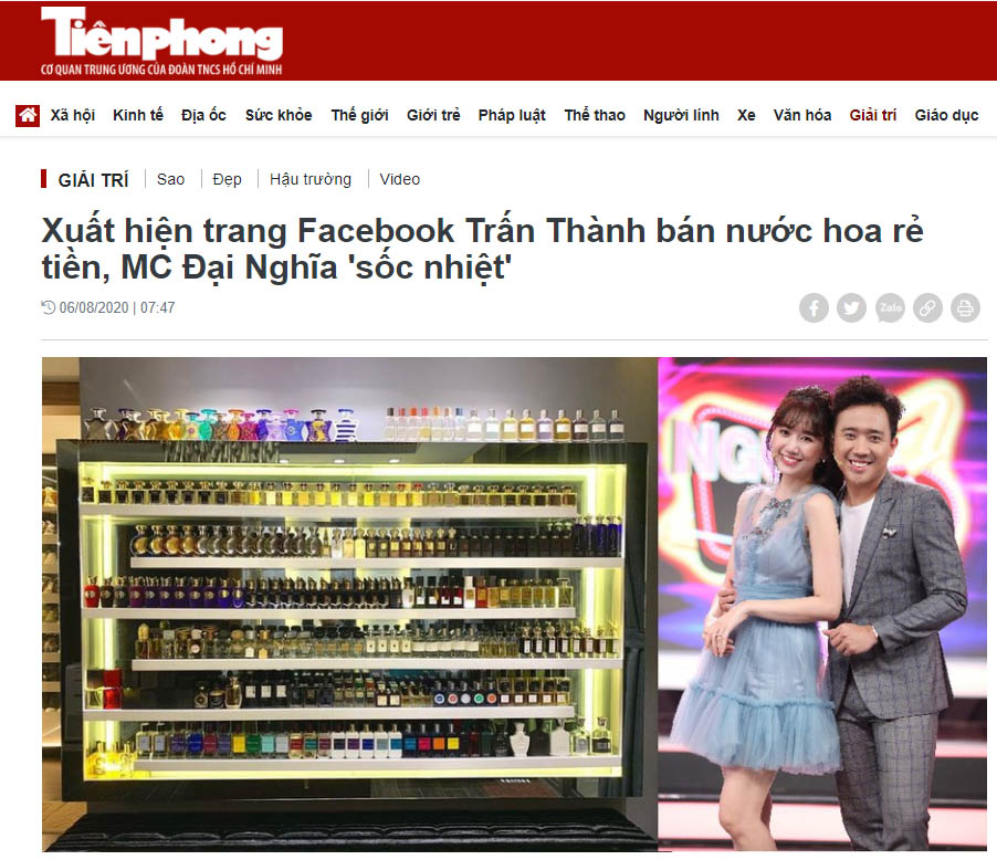 Nam MC này liên tục bị nhiều trang Fanpage giả mạo đăng nhiều hình ảnh Trấn Thành review nước hoa tiền tỉ để rao bán nước hoa chiết giá rẻ hơn khiến người dùng ngỡ ngàng và bị mắc lừa.